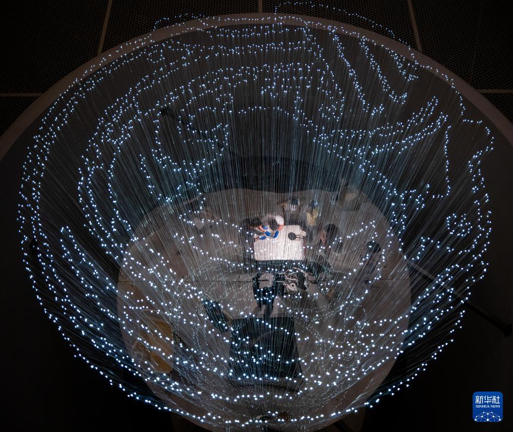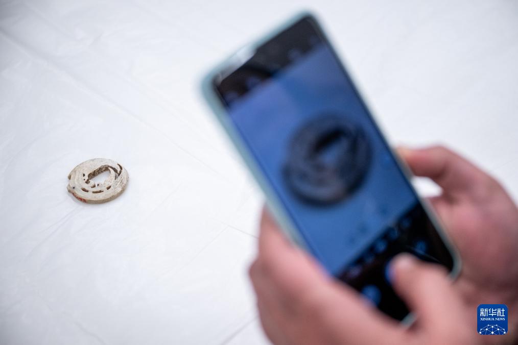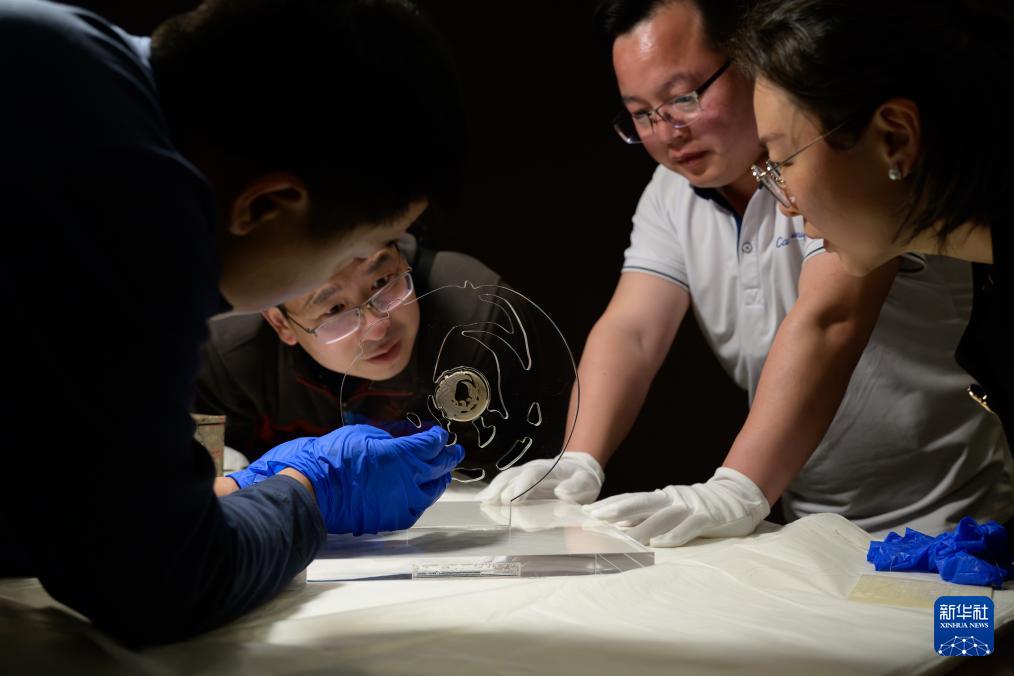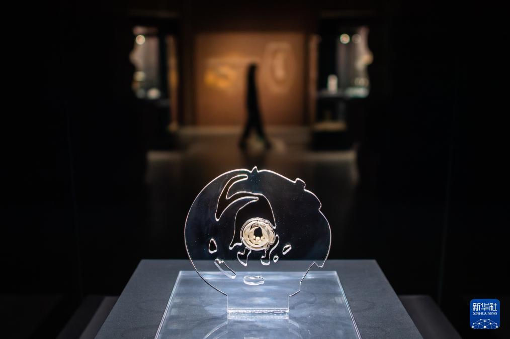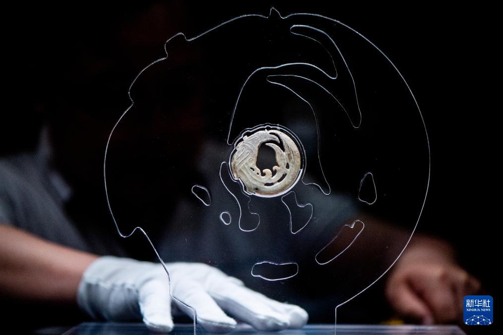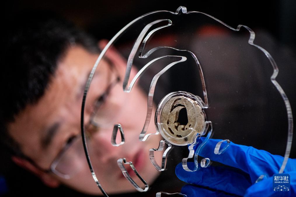 3月30日,工作人員在固定展品玉團(tuán)鳳。為迎接玉團(tuán)鳳,武漢盤龍城遺址博物院在玉團(tuán)鳳展柜上方將燈光布置成玉團(tuán)鳳形狀。