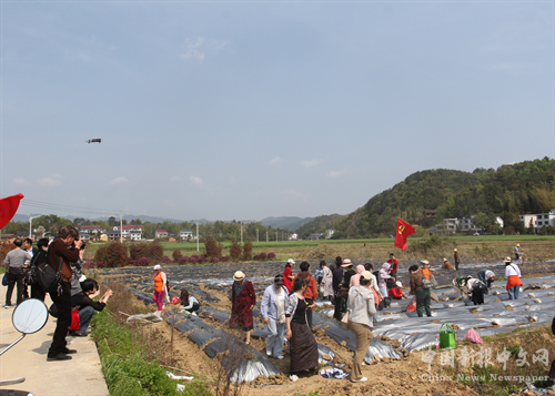 大家來到何家大垅里,天臺山風(fēng)景區(qū)管委會主任、辣椒項目基地負(fù)責(zé)人李雪陽告訴說:“為實現(xiàn)農(nóng)文旅融合發(fā)展,助推鄉(xiāng)村振興,我們今年在攸縣北鄉(xiāng)片實施了3400畝的辣椒種植,讓消失了20多年的‘坪陽三寶’之一的‘皇椒1號’回家。”并現(xiàn)場請老農(nóng)講述辣椒栽插的操作技術(shù),大家在班委會的組織指揮下,有條不亂地深入田間,分發(fā)椒苗,蹲身用小樹枝撬穴,將一棵棵小辣椒苗插入其中,并松緊適度地摁好蔸下土,讓小苗昂首挺立,一幅田間人頭攢動,昔日大集體時代出集體工的輝宏場面,重現(xiàn)在人們眼前!