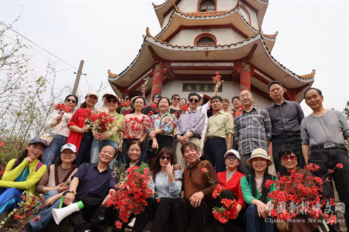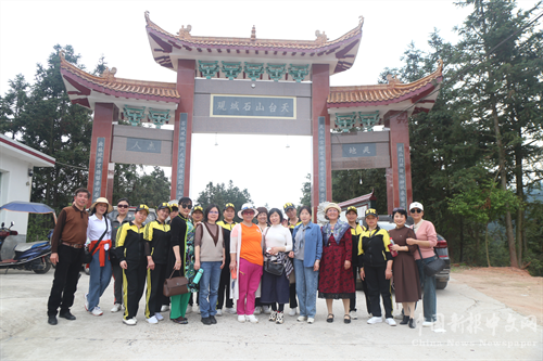 中飯后,氣溫竄至了三十多度,但他們的采風(fēng)興趣絲毫未減,仍頂烈日,登上了海拔231米高的石城觀,到有著700年悠久歷史、高聳云端的天臺寶塔游覽,見路邊的映山紅開得像火一樣的紅艷,他們又爭先恐后進(jìn)裝進(jìn)花叢“咔咔”拍照……
