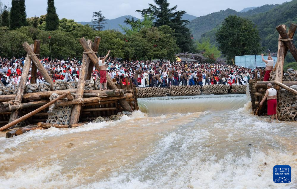 4月4日,在2024都江堰放水節(jié)上,演員們用竹竿打水頭。