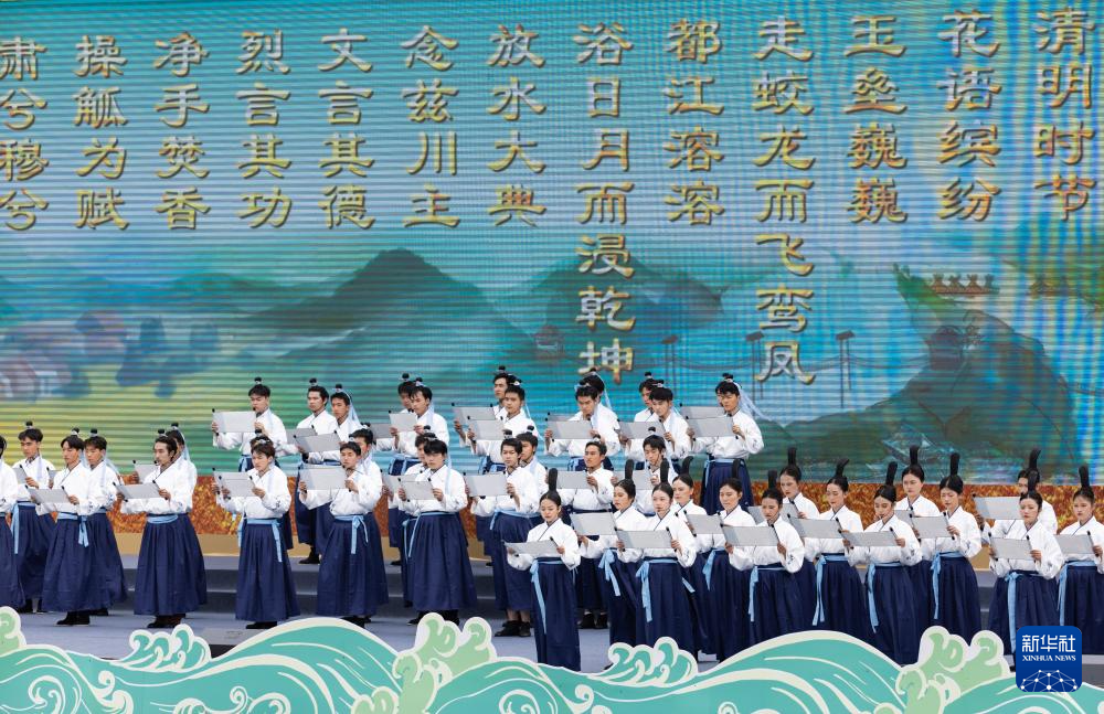 4月4日,在2024都江堰放水節(jié)上,舞臺上的演員帶領(lǐng)嘉賓、游客一起齊誦祭文。