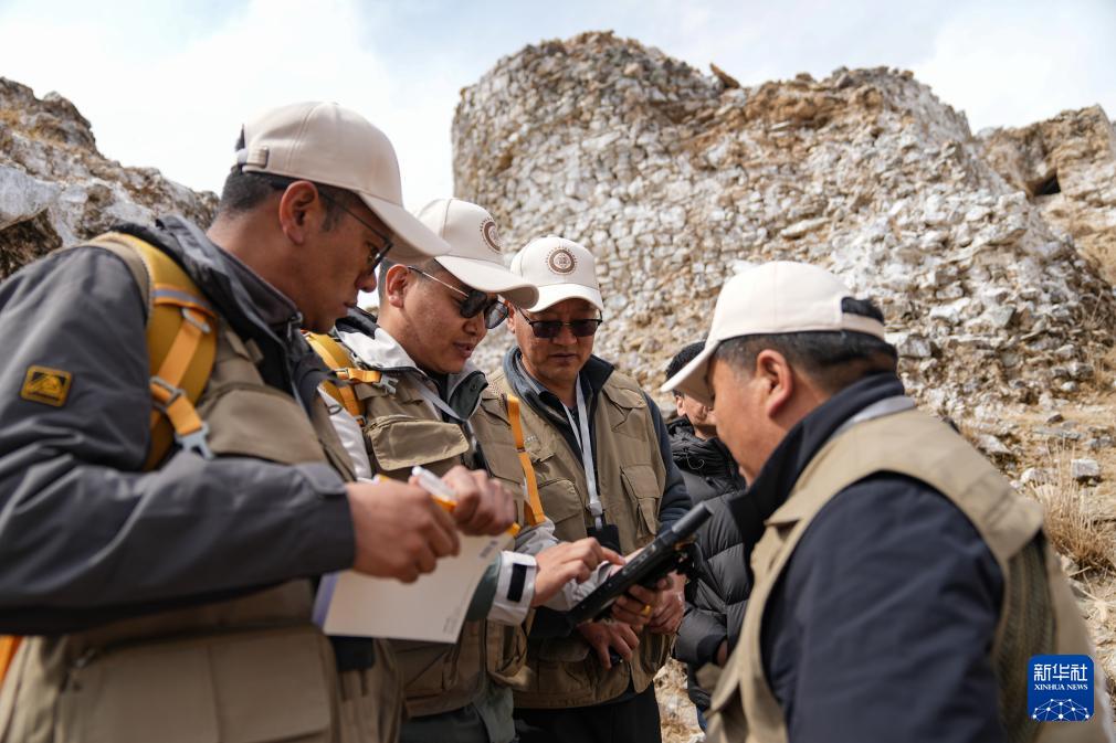 4月11日,普查人員手持移動(dòng)端數(shù)據(jù)采集設(shè)備在曲果崗塔群遺址現(xiàn)場(chǎng)開展數(shù)據(jù)采集。新華社記者 晉美多吉 攝