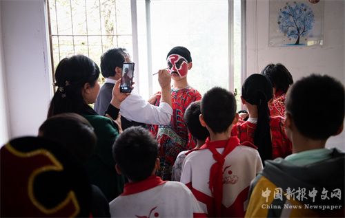天柱縣渡馬鎮(zhèn)小學(xué)少年宮侗戲班戲師在畫臉譜