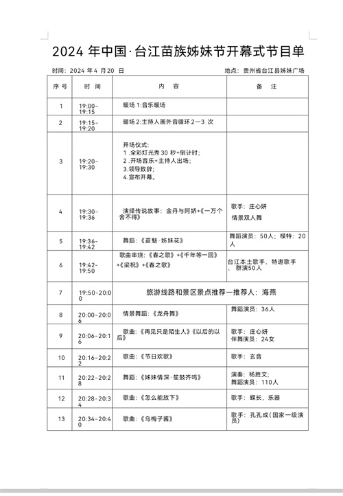 開幕式以鑄牢中華民族共同體意識(shí)為主線,以苗族姊妹節(jié)金丹與阿嬌的愛情故事為主題,以歌舞、情景集表演等為載體;開幕式邀請(qǐng)李玉剛、張英席、孔孔成、莊心妍、夢(mèng)然等歌手助力。