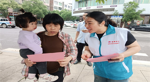 ▲志愿者向過往群眾發(fā)放防溺水宣傳單