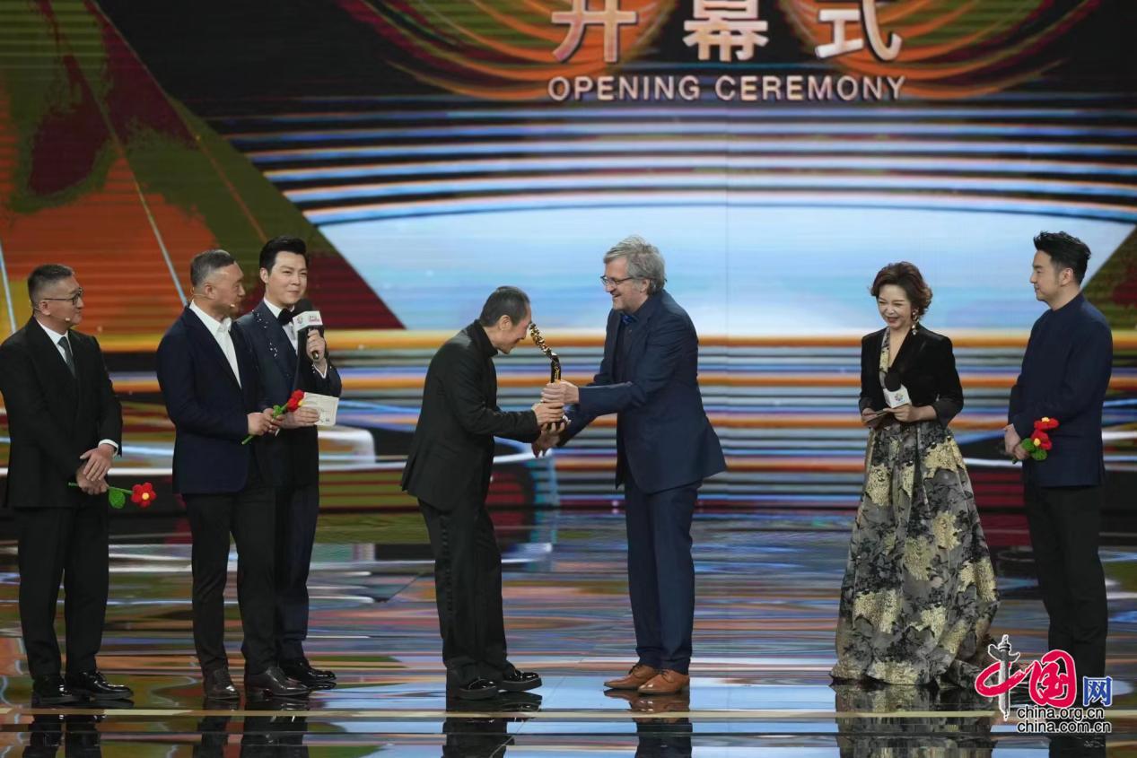 埃米爾·庫斯圖里卡為中國導演張藝謀頒發(fā)組委會特別榮譽獎。攝影 崔峻