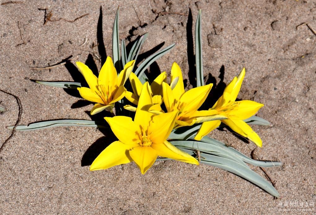據(jù)周繇介紹,蒙古郁金香是多年生草本植物,植株高10至25厘米,花為鮮黃色,花期5月份,果期6月份,生于草原帶覆沙地中,僅分布于我國(guó)內(nèi)蒙古,是當(dāng)?shù)靥赜蟹N,也是郁金香屬植物在全球分布最東的一個(gè)物種。