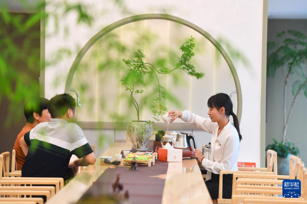 5月7日,在武夷山市一茶企展廳內(nèi),工作人員為客人泡茶。