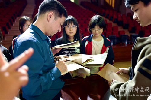 胡老師用生動的語言為三百余名學生講述了如何寫一筆好看的字,課堂上同學們興趣較大、積極參與,從他們的臉上可以看到他們受益匪淺。會后還邀請胡老師簽名、握手、合影。(通訊員 鄧星遠 鐘瑤)