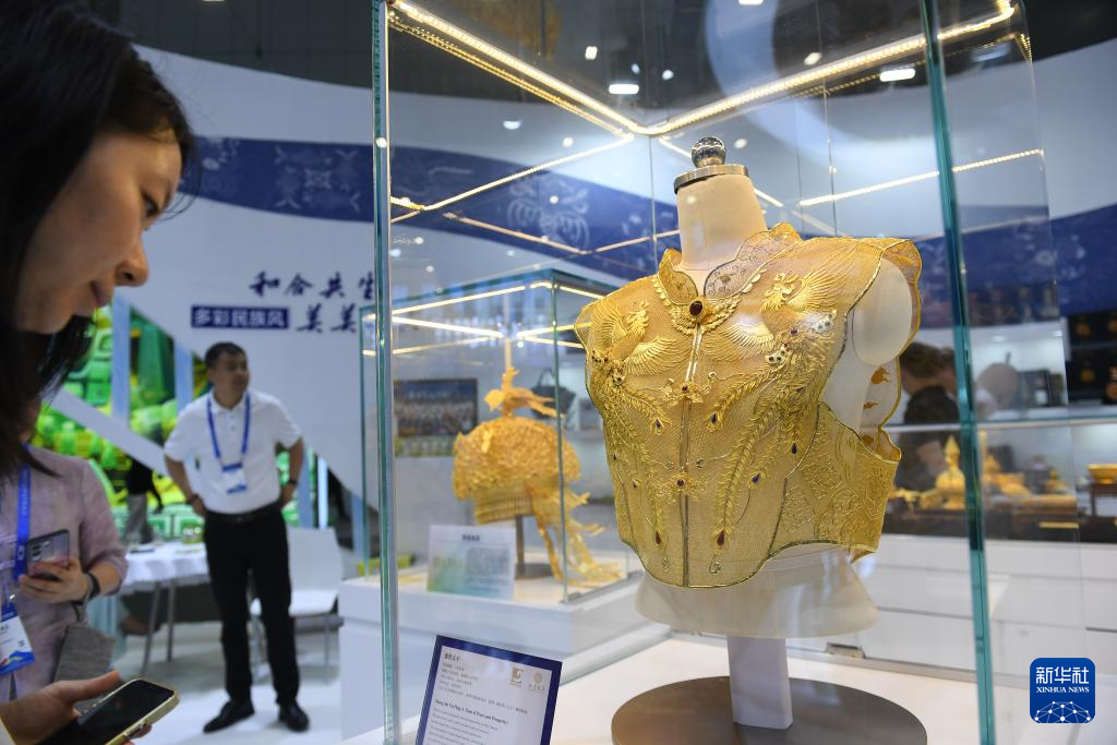 5月23日,觀眾在第二十屆文博會上觀看展出的龍鳳霞帔金衣。