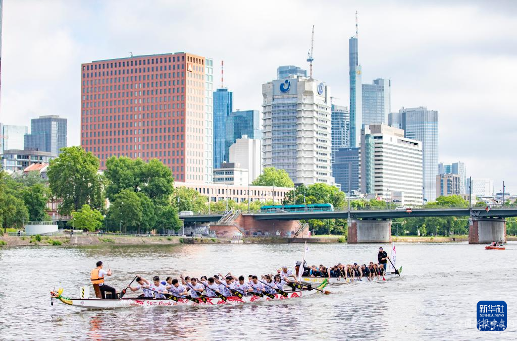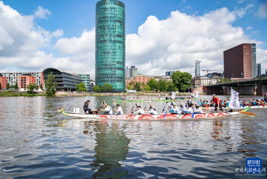 5月25日,在德國法蘭克福,龍舟隊伍在美因河上參加比賽。