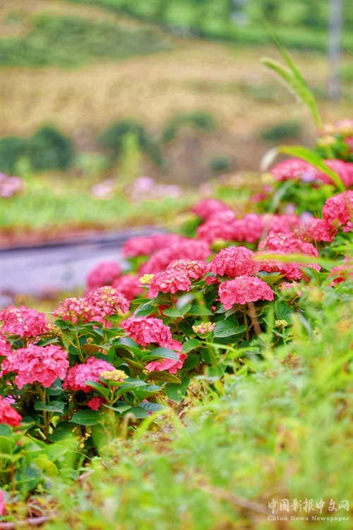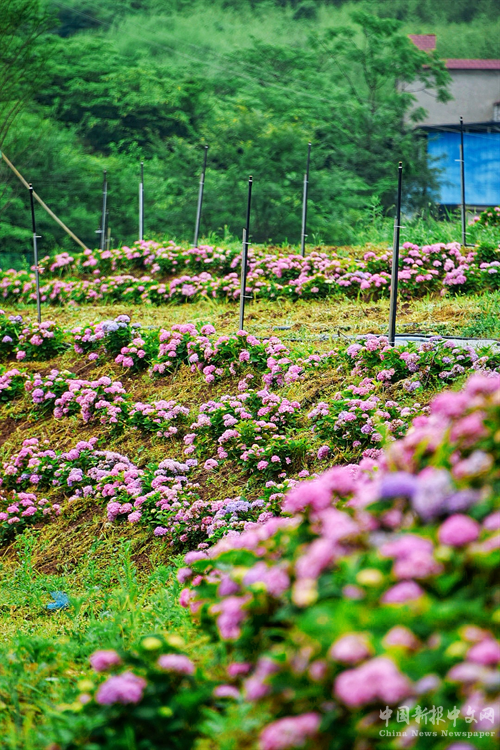 目前,該繡球園投資達(dá)500萬(wàn)元,共有紅舞、吉祥、雪球等4個(gè)繡球品種1.3萬(wàn)余株,種植面積達(dá)150畝。盛開(kāi)的繡球花與堰頭村的山水相依相偎,共同見(jiàn)證著村子的滄桑變遷,訴說(shuō)著鄉(xiāng)村振興的美好故事。