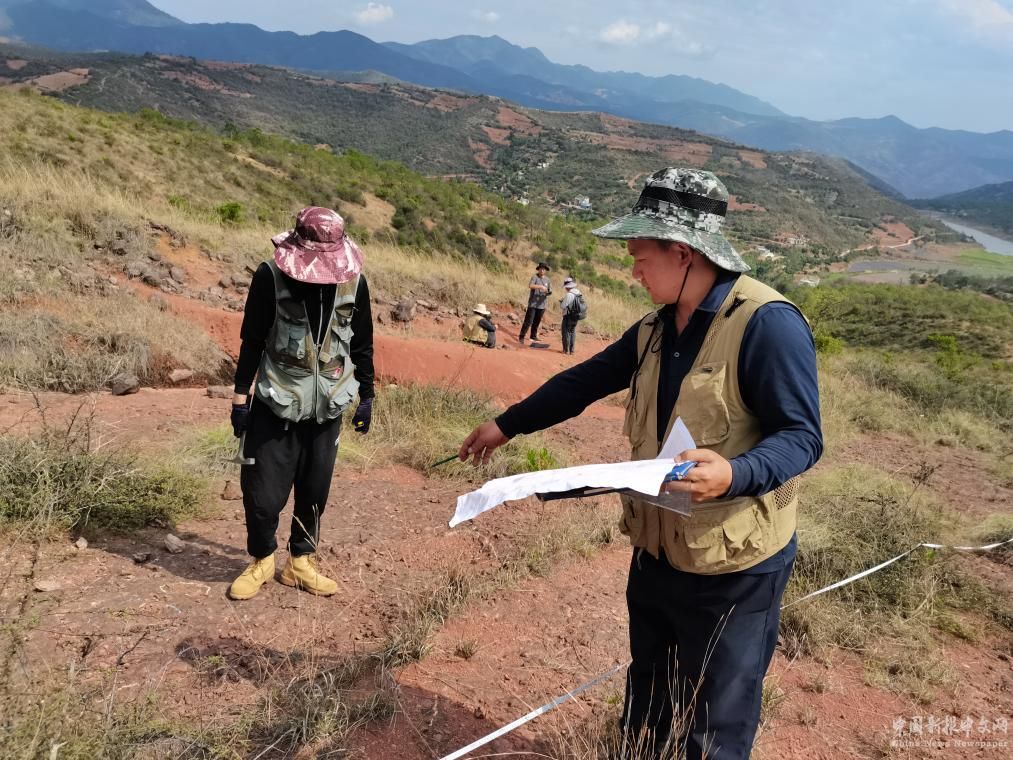 工作人員在現(xiàn)場測量恐龍足跡化石。(祿豐市融媒體中心供圖)