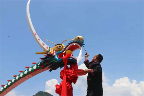 開幕儀式結(jié)束后,依照當(dāng)?shù)孛袼祝M(jìn)行傳統(tǒng)祭祀儀式,備受關(guān)注的98.8米長木龍舟在這里完成龍頭點(diǎn)睛,寓意平安吉祥。