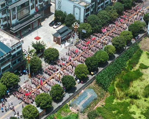 隨后,千名赤膊光膀、頭系紅繩的壯漢,肩并肩腳碰腳,在整齊劃一的口號聲中,抬起98.8米木龍舟沿街巡游入江展演,他們沿著約二三公里的街道前進(jìn),抬龍隊(duì)伍后面緊隨的是盛裝游行的姑媽方隊(duì)和民俗方陣,浩浩蕩蕩的展演隊(duì)伍擠滿街道,現(xiàn)場力量與文化交融展示異常震撼、壯觀。