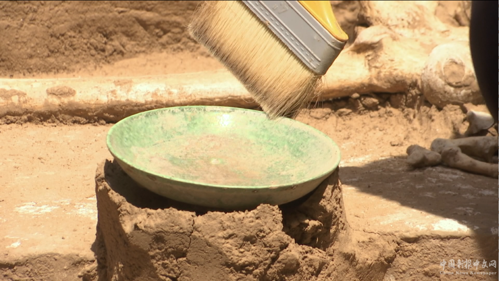 圖為在本次發(fā)掘中出土的綠釉瓷盤(pán)。(李婥 攝)