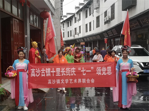 7月1日上午,高沙鎮(zhèn)文聯(lián)組織100名會(huì)員統(tǒng)一著裝,手拿小紅旗,舉著橫幅等走上鎮(zhèn)主要街道游行宣傳。游行隊(duì)伍所到之處深深吸引了街道倆邊居民,過(guò)往群眾抬頭、駐足觀賞及熱情鼓掌。街道不同地點(diǎn)的文藝表演緊緊抓?。浩咭?ldquo;慶黨節(jié),頌黨恩內(nèi)容,歌舞表演《梨花頌》、《唱支山歌給黨聽》,抒發(fā)愛國(guó)情懷的詩(shī)朗誦《鶯啼序·長(zhǎng)江》和充滿回憶的男聲小組唱《喀秋莎》等,把游行活動(dòng)推向了高潮。