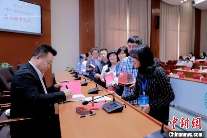 圖為邱華棟向部分參會(huì)代表進(jìn)行現(xiàn)場(chǎng)簽名贈(zèng)書。 內(nèi)蒙古師范大學(xué)供圖