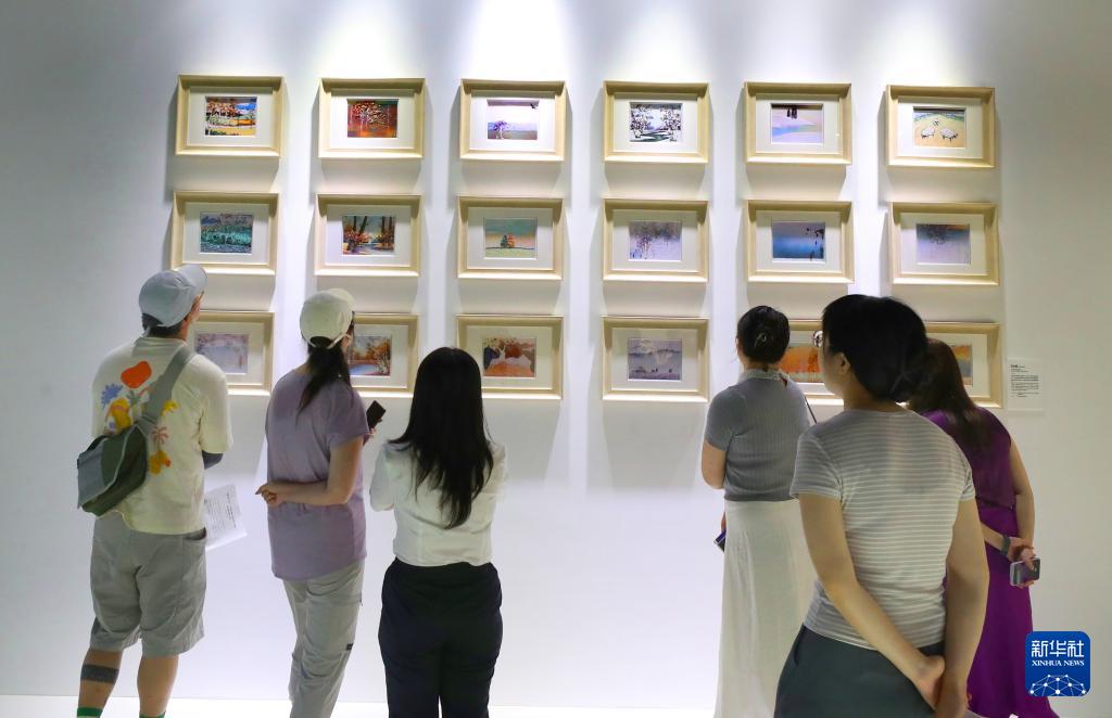 7月16日,參觀者在寶石畫藝術(shù)家劉全霞的作品墻前駐足觀看。