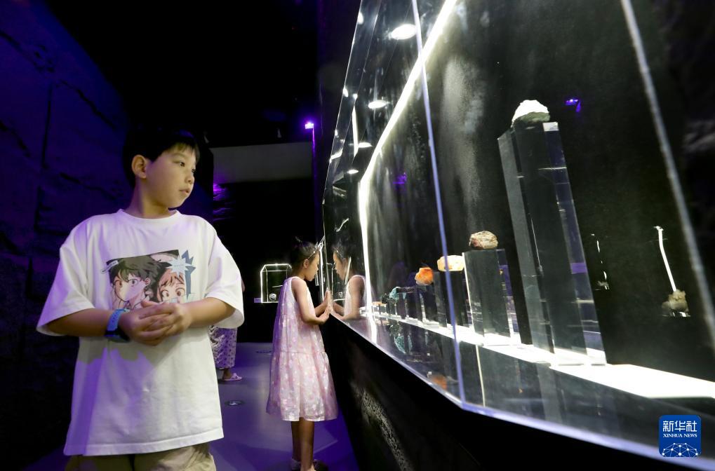 7月16日,一名小朋友在重逾1噸的“巨無霸滿天星”晶洞前駐足觀看。