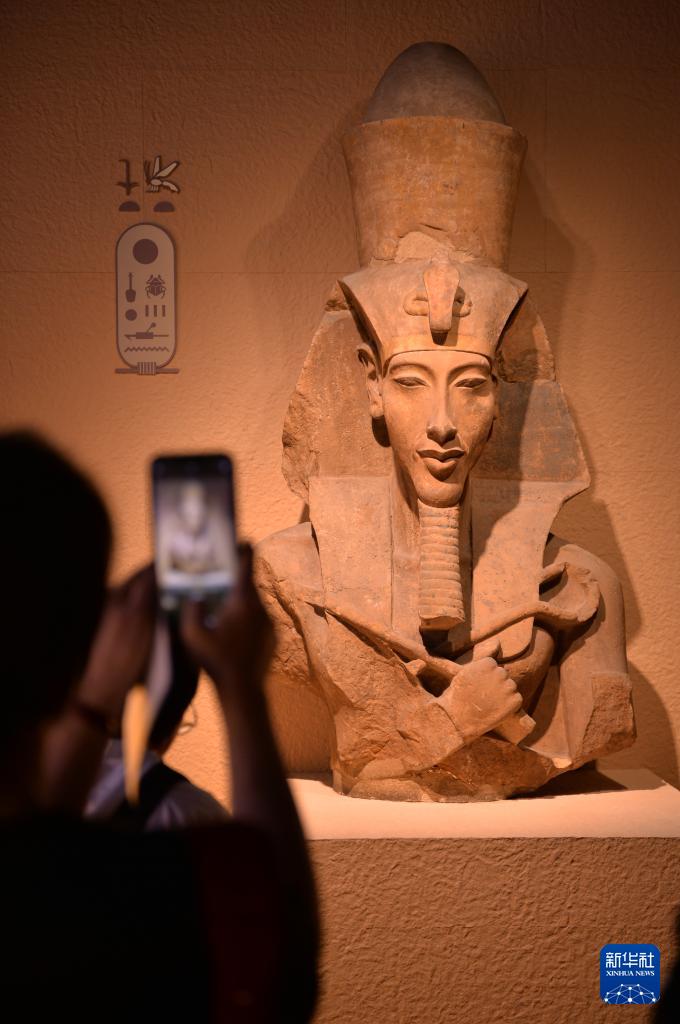 “法老的國度”展區(qū)展示的舍本索普度特塑像(7月16日攝)。