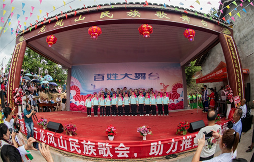 “四十八寨民歌開,唱響民族大舞臺,城鄉(xiāng)發(fā)展新時代,歡聲笑語樂開懷!”
