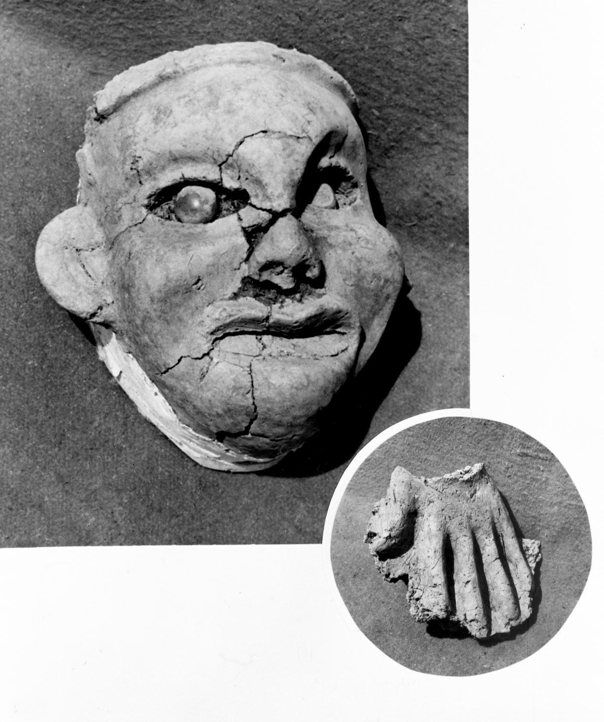 1983年10月,考古工作者在牛河梁遺址女神廟主室西側(cè)群像殘?bào)w中,首次發(fā)現(xiàn)一個(gè)較完整的接近真人大小的彩塑女神頭像,其眼珠是用綠色磨圓玉片鑲嵌而成,右下圖為女神左手。