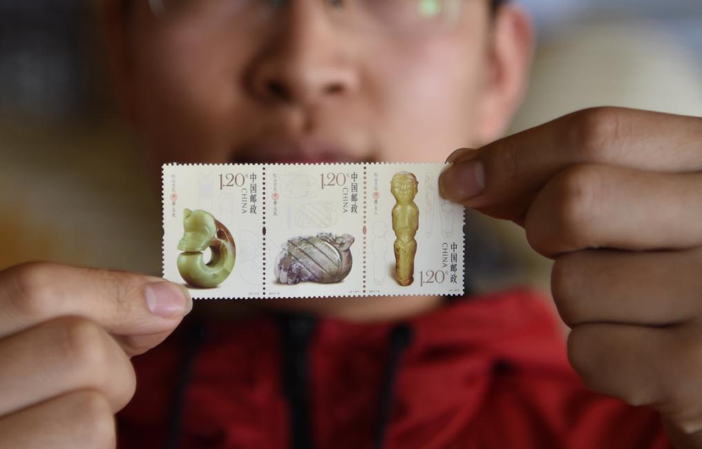 2017年4月9日,集郵愛好者在牛河梁遺址博物館展示《紅山文化玉器》特種郵票。