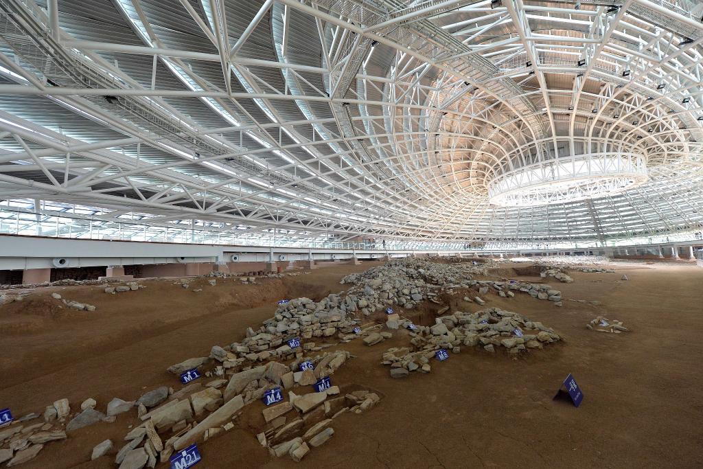 2014年6月14日拍攝的牛河梁國家考古遺址公園祭壇、積石冢保護(hù)展示館內(nèi)景。