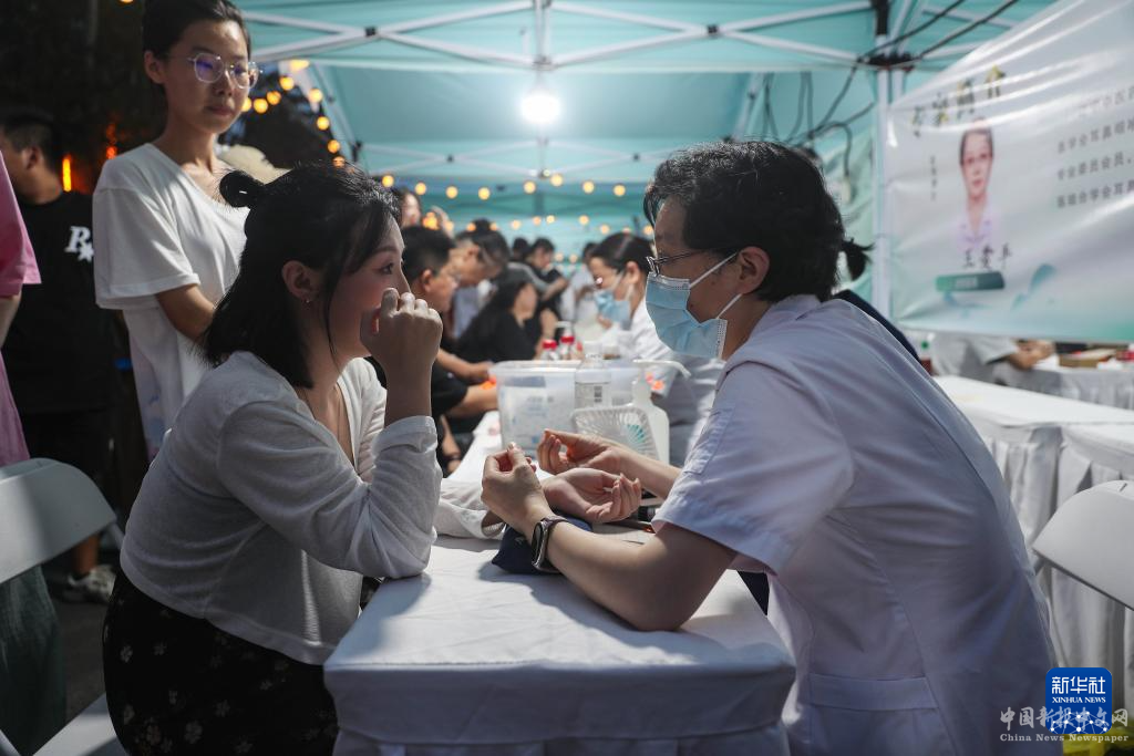 8月9日,在中醫(yī)藥文化夜市的義診區(qū)域,醫(yī)生為患者號(hào)脈。