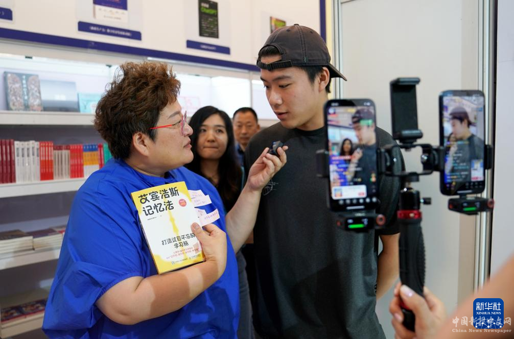 8月14日,參展商在2024上海書展現(xiàn)場(chǎng)直播銷售圖書。