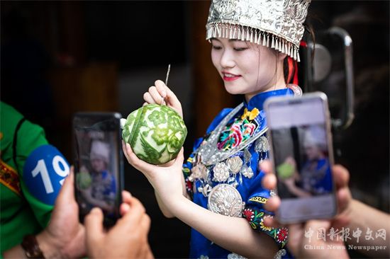 游客在天柱縣地湖鄉(xiāng)”柚蜜姑娘“雕花蜜餞大賽現(xiàn)場直播。