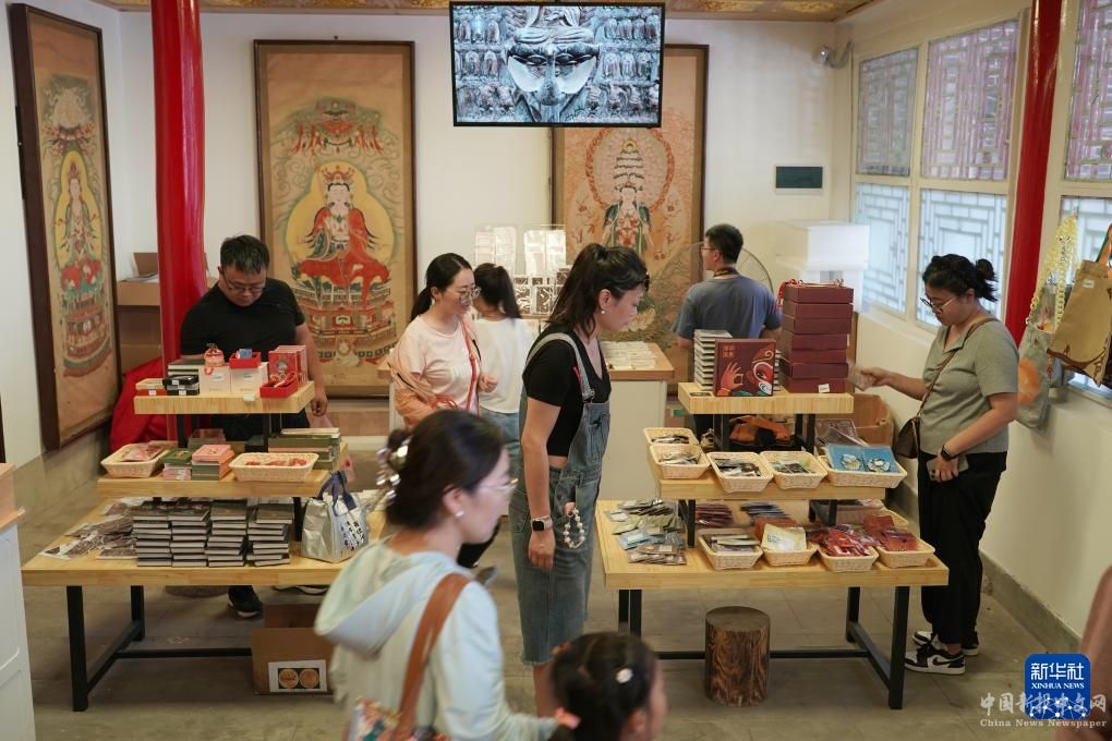 9月16日,游客在陜西西安藍(lán)田縣水陸庵內(nèi)選購文創(chuàng)產(chǎn)品。