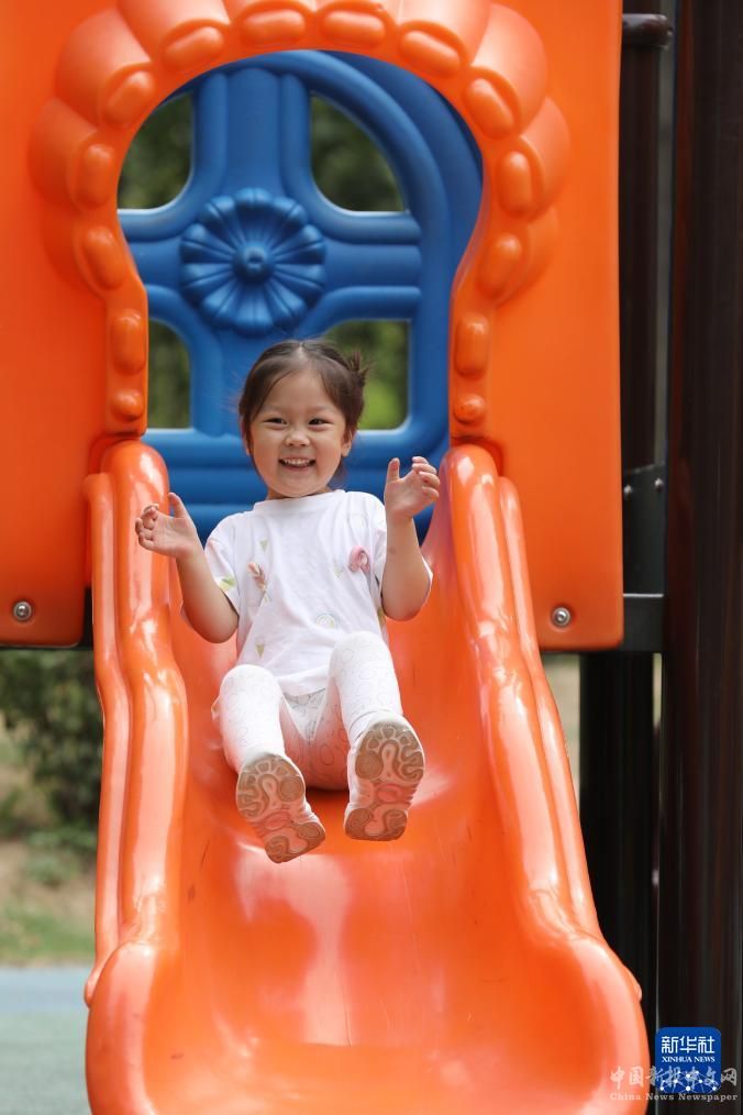 9月16日,一名小朋友在河南省焦作市溫縣子夏公園兒童運(yùn)動區(qū)玩滑梯。