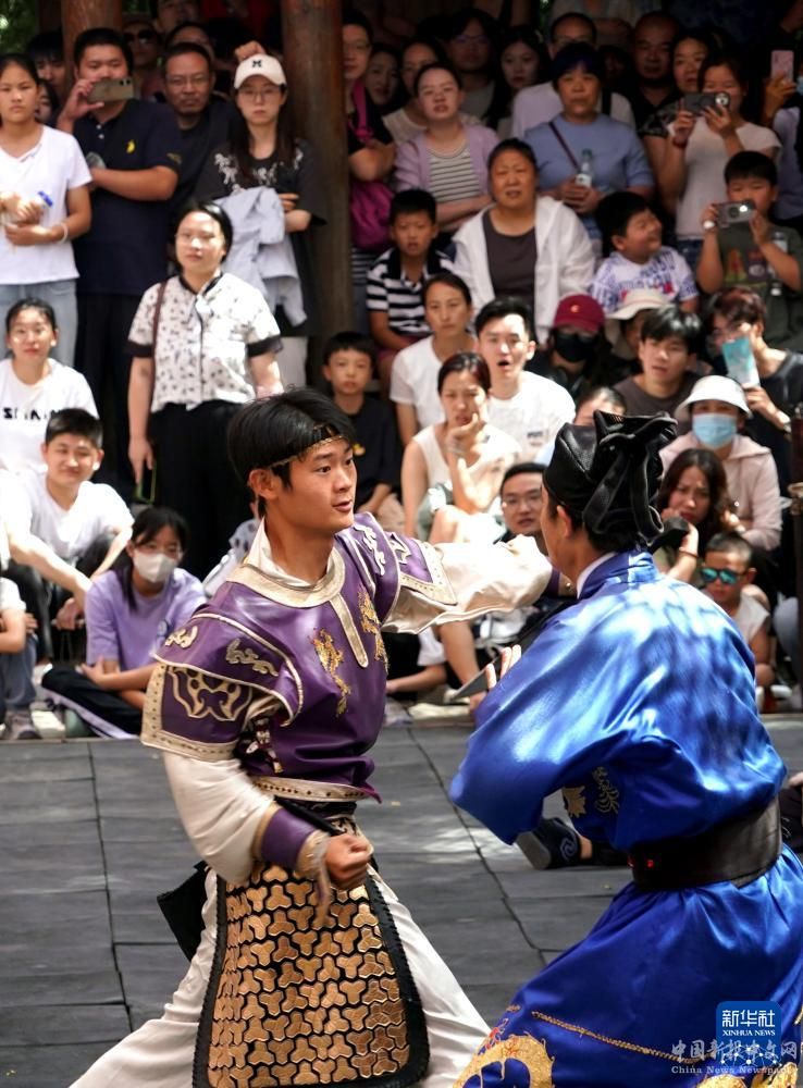 9月16日,游客在位于河南省開封市的萬歲山武俠城內(nèi)觀看表演。