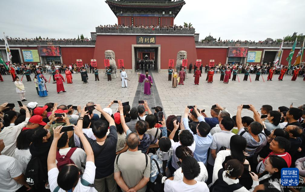 9月16日,游客在河南省開封市開封府門前觀看《開衙迎賓》儀式。