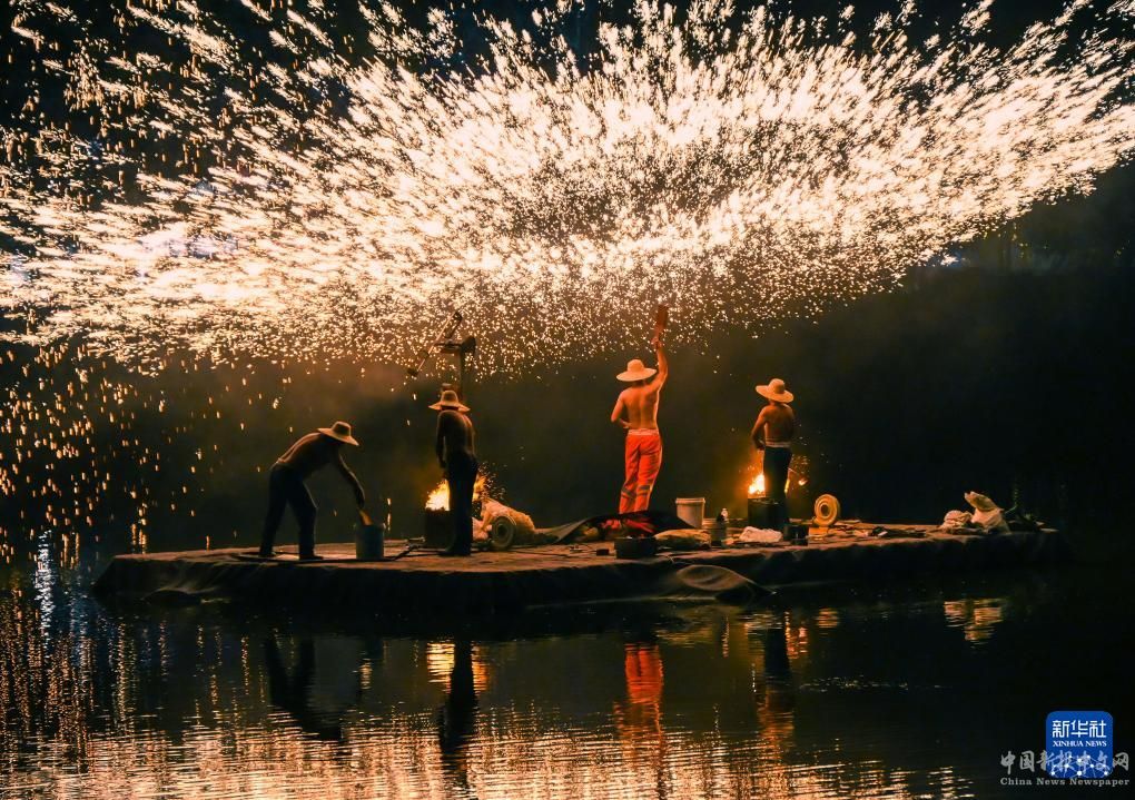 這是9月16日在安徽省宿州市碭山縣梨小萌歡樂梨園景區(qū)拍攝的打鐵花表演。