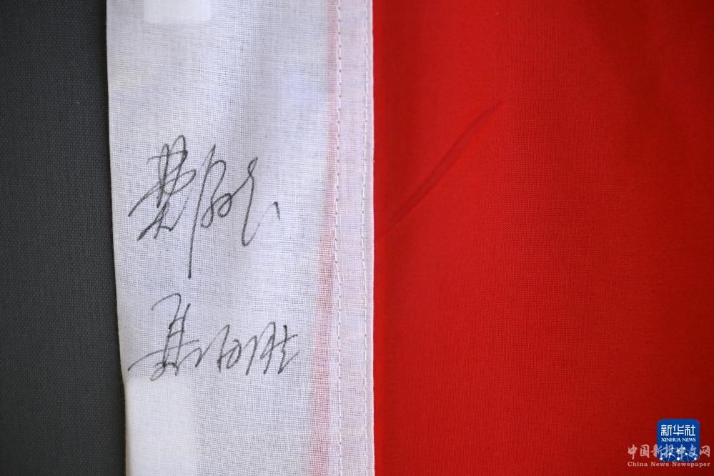 9月29日在展覽上拍攝的航天員費俊龍、聶海勝在搭乘“神舟”六號載人飛船飛行時展示的國旗上的簽名。