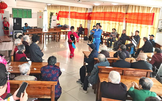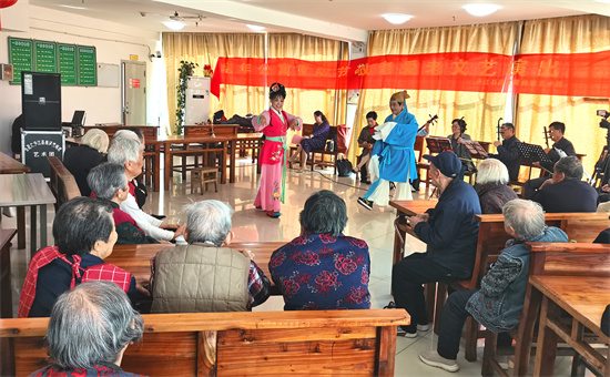 2024年10月9日,重陽(yáng)節(jié)來(lái)臨之際,安徽省合肥市廬江縣怡和園老年公寓內(nèi)絲弦樂(lè)起,唱腔悠揚(yáng),當(dāng)?shù)匾患依C溪黃梅戲藝術(shù)團(tuán)的演員們走近老人身邊,上演《夫妻觀燈》《討學(xué)錢(qián)》等老人們喜愛(ài)的傳統(tǒng)黃梅戲、廬劇曲目,為老人送上節(jié)日的祝福。(巢志斌 攝)
