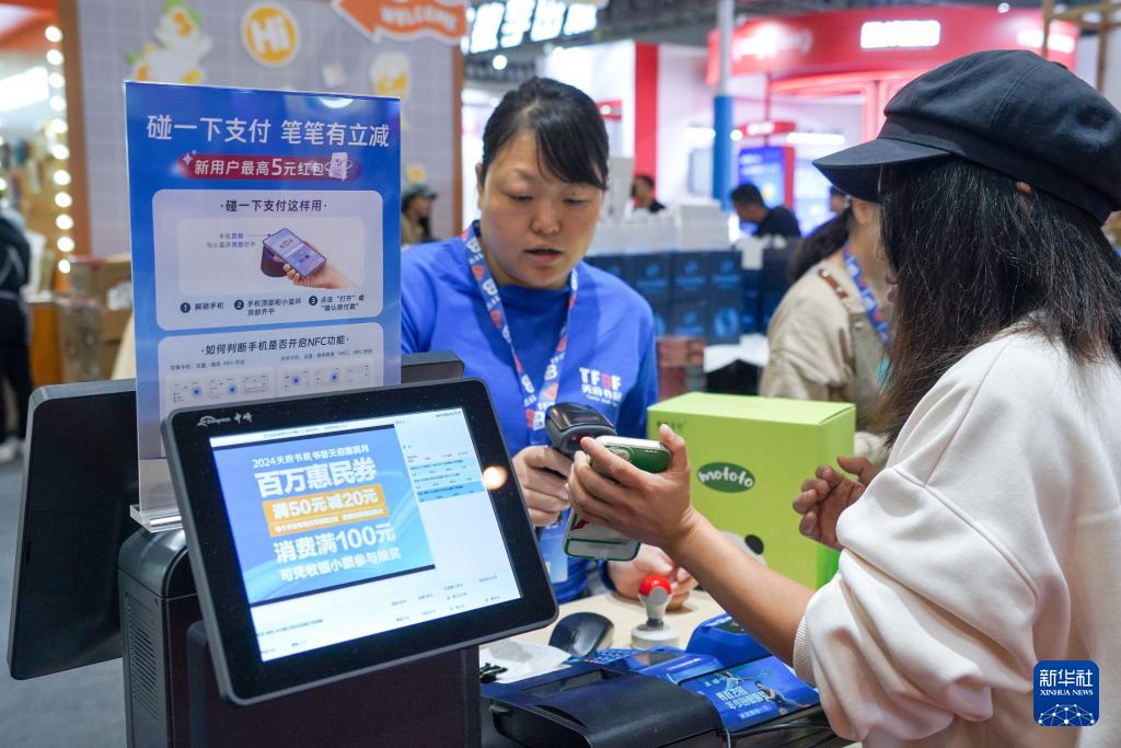 10月11日,讀者在2024天府書展現(xiàn)場(chǎng)使用購(gòu)書惠民券結(jié)賬。