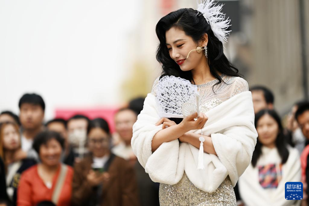10月26日,演員在天津金街表演話劇《日出》片段。
