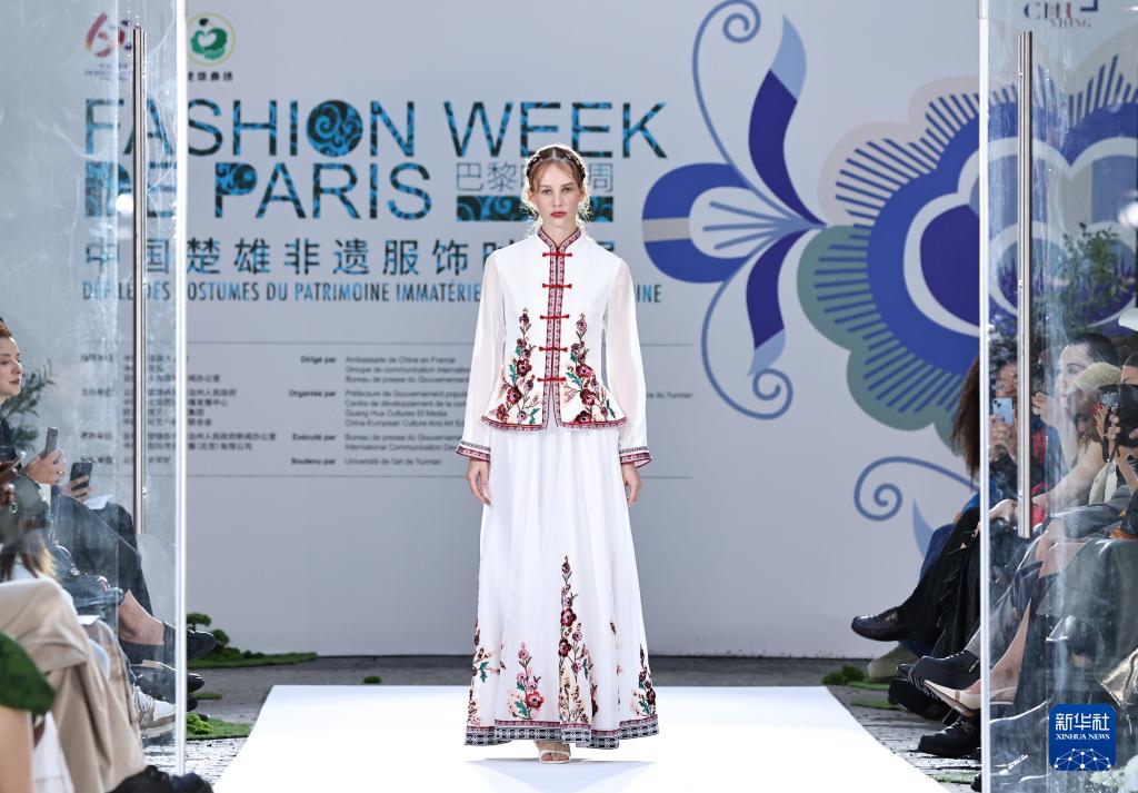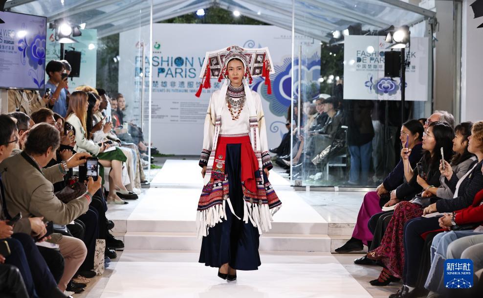 9月26日,模特在法國(guó)巴黎舉行的中國(guó)楚雄非遺服飾時(shí)裝展上展示時(shí)裝。