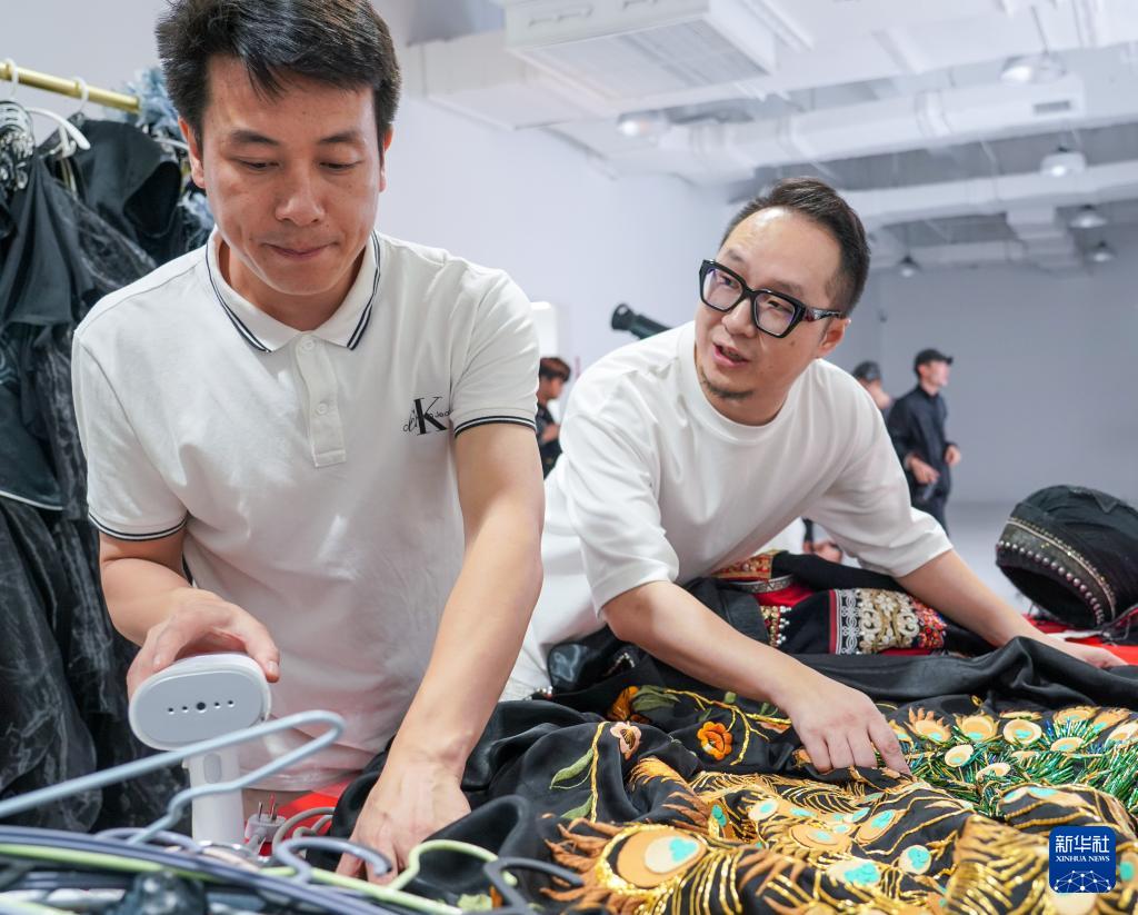 8月27日,在昆明一處攝影棚內(nèi),云南藝術(shù)學(xué)院設(shè)計(jì)學(xué)院服裝與服飾設(shè)計(jì)系教師范佳(右)和同事打理彝繡服飾。范佳是赴巴黎參展彝族服飾作品的設(shè)計(jì)師之一。