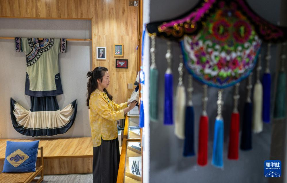 9月7日,國(guó)家級(jí)非物質(zhì)文化遺產(chǎn)代表性項(xiàng)目彝族服飾州級(jí)代表性傳承人盧潔瑩在自己云南楚雄的工作室內(nèi)查看彝繡服飾。盧潔瑩是赴巴黎參展彝族服飾作品的設(shè)計(jì)師之一。