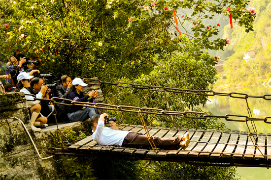 在重安江三朝橋,這三座不同歷史年代修建的橋梁不僅見證了歲月的滄桑,更以其獨(dú)特的建筑風(fēng)貌成為了拍攝風(fēng)光及人像的絕佳地點(diǎn)。攝影師們紛紛架起相機(jī),捕捉著橋下潺潺流水與遠(yuǎn)處山巒的交相輝映,同時(shí)也不忘記錄下模特們在橋上跳水、游泳的生動(dòng)瞬間,將人與自然的和諧共處定格為永恒。 隨后,采風(fēng)團(tuán)隊(duì)移步至小院泳紀(jì),這里不僅是一處寧靜的休憩之所,更是傳統(tǒng)民俗與民宿文化產(chǎn)業(yè)交相輝映的典范。