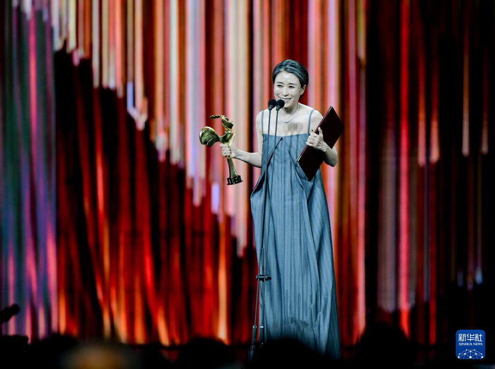 11月16日,劉丹在臺(tái)上領(lǐng)獎(jiǎng)。劉丹憑借《乘船而去》獲得最佳女配角獎(jiǎng)。