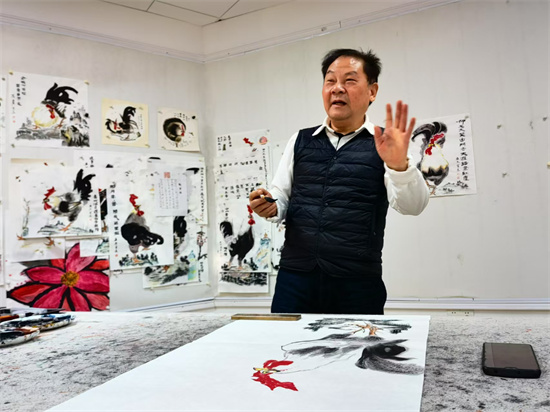 崔國(guó)強(qiáng)邊畫(huà)雞邊吟詩(shī)(胡立強(qiáng)攝)
