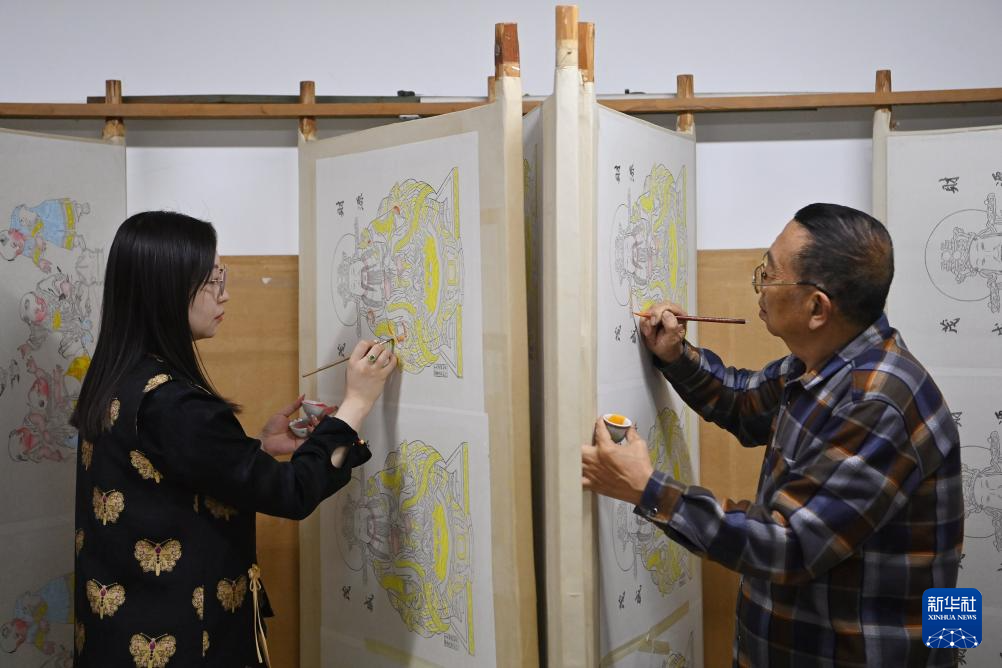 12月25日,“玉成號(hào)”年畫坊的畫師在繪制楊柳青木版年畫。
