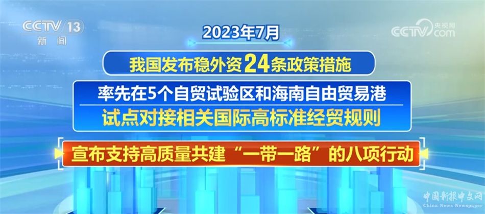 2023年7月,我國發(fā)布穩(wěn)外資24條政策措施,率先在5個自貿(mào)試驗區(qū)和海南自由貿(mào)易港試點對接相關(guān)國際高標準經(jīng)貿(mào)規(guī)則,宣布支持高質(zhì)量共建“一帶一路”的八項行動。