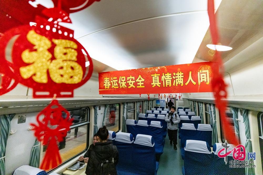 春運首日北京地區(qū)首趟普速列車K5207次上的溫馨裝飾。中國網記者 鄭亮攝